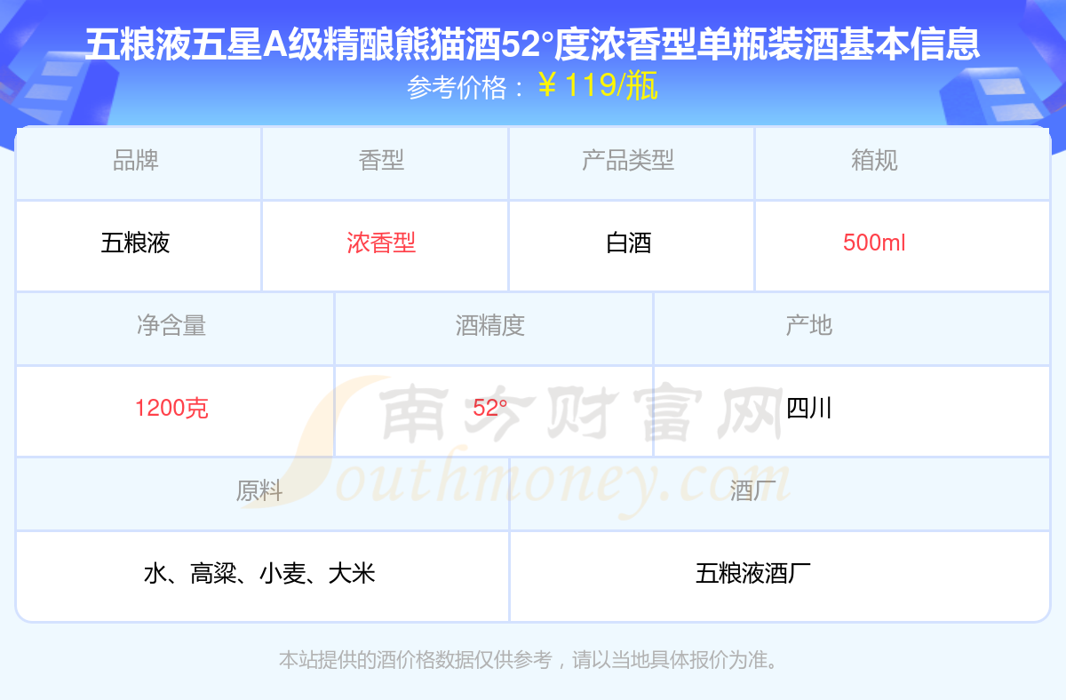 五糧液五星A級精釀熊貓酒52°度濃香型單瓶裝基本信息