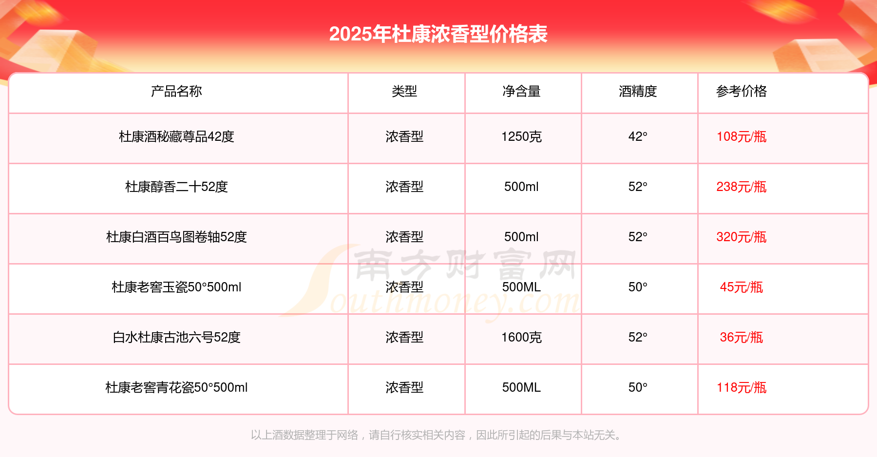 2025年,杜康白酒百鳥圖卷軸52度、杜康醇香二十52度、杜康老窖青花瓷50°500ml、杜康酒秘藏尊品42度、杜康老窖玉瓷50°500ml、白水杜康古池六號(hào)52度等杜康濃香型酒價(jià)格如下: