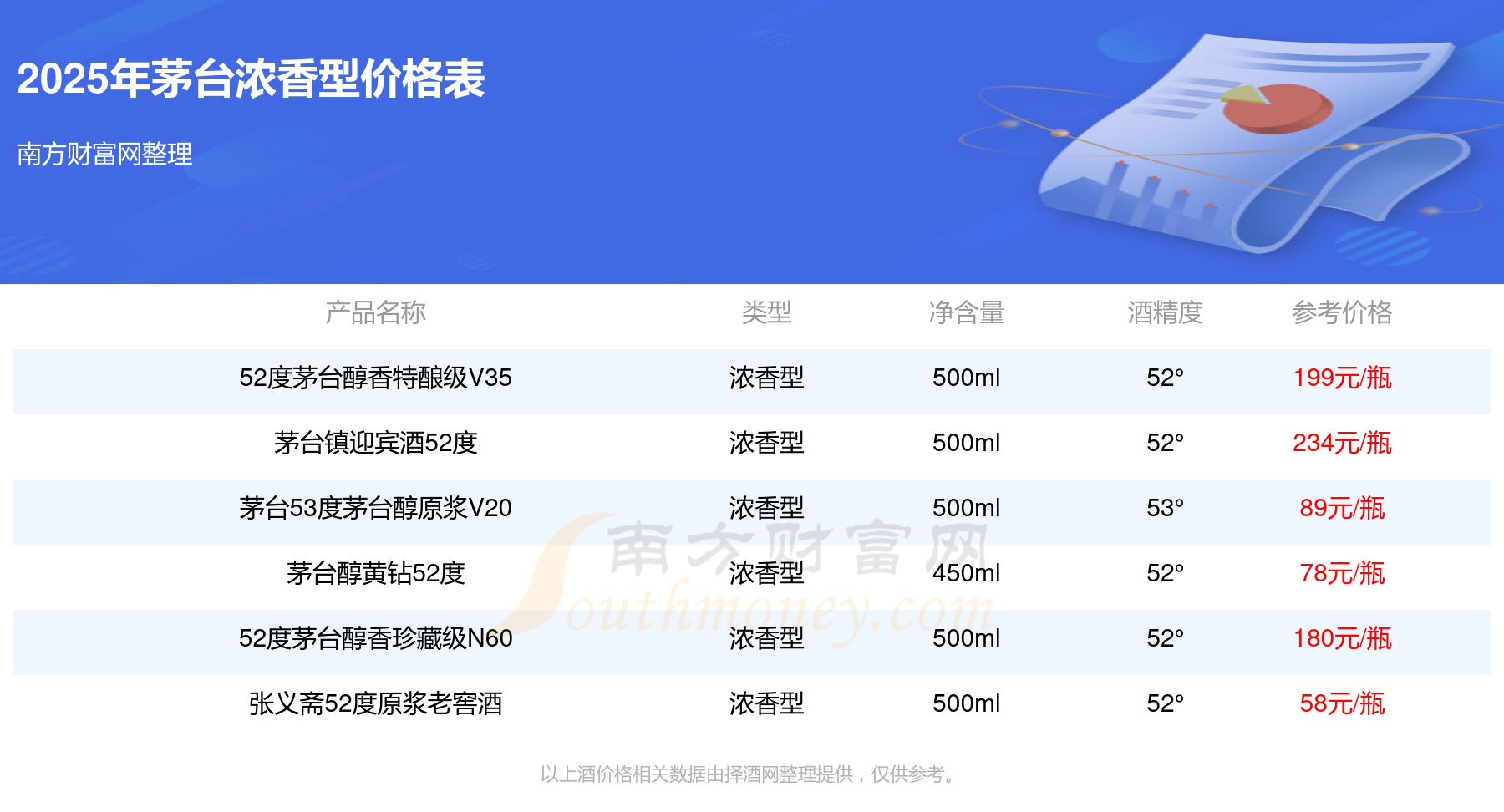 茅臺鎮(zhèn)迎賓酒52度參考價234元/瓶、52度茅臺醇香特釀級V35參考價199元/瓶、52度茅臺醇香珍藏級N60參考價180元/瓶、茅臺53度茅臺醇原漿V20參考價89元/瓶、茅臺醇黃鉆52度參考價78元/瓶。