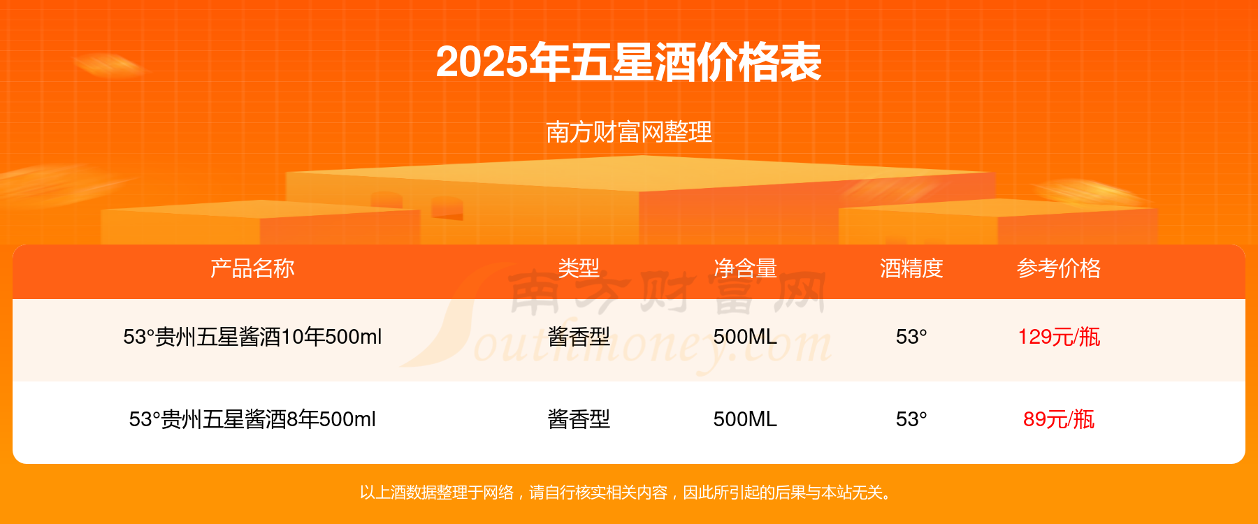 五星酒最新價(jià)格2025:53°貴州五星醬酒10年500ml參考價(jià)129元/瓶、53°貴州五星醬酒8年500ml參考價(jià)89元/瓶。