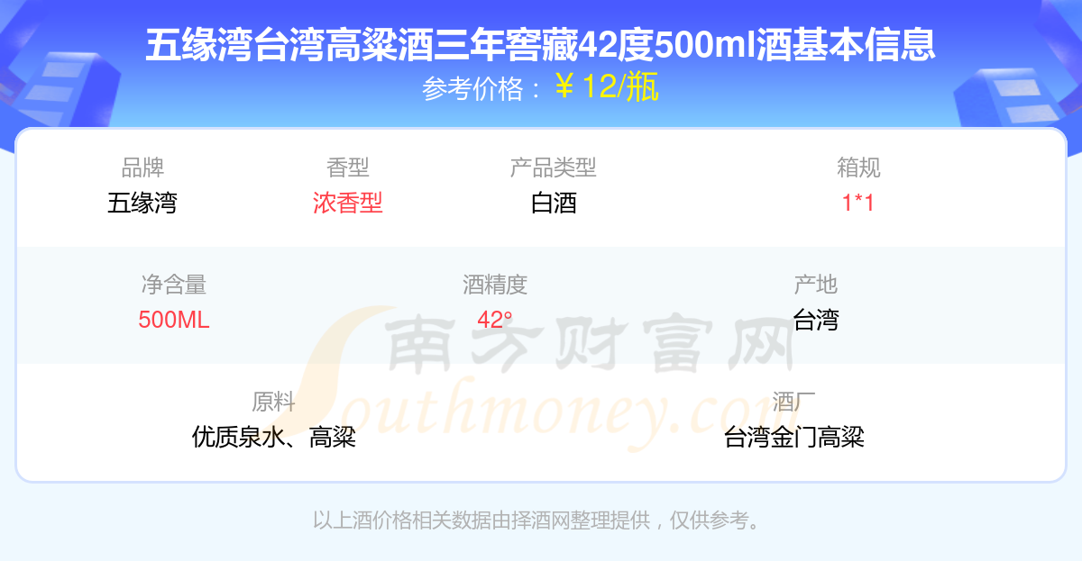 五緣灣臺(tái)灣高粱酒三年窖藏42度500ml基本信息