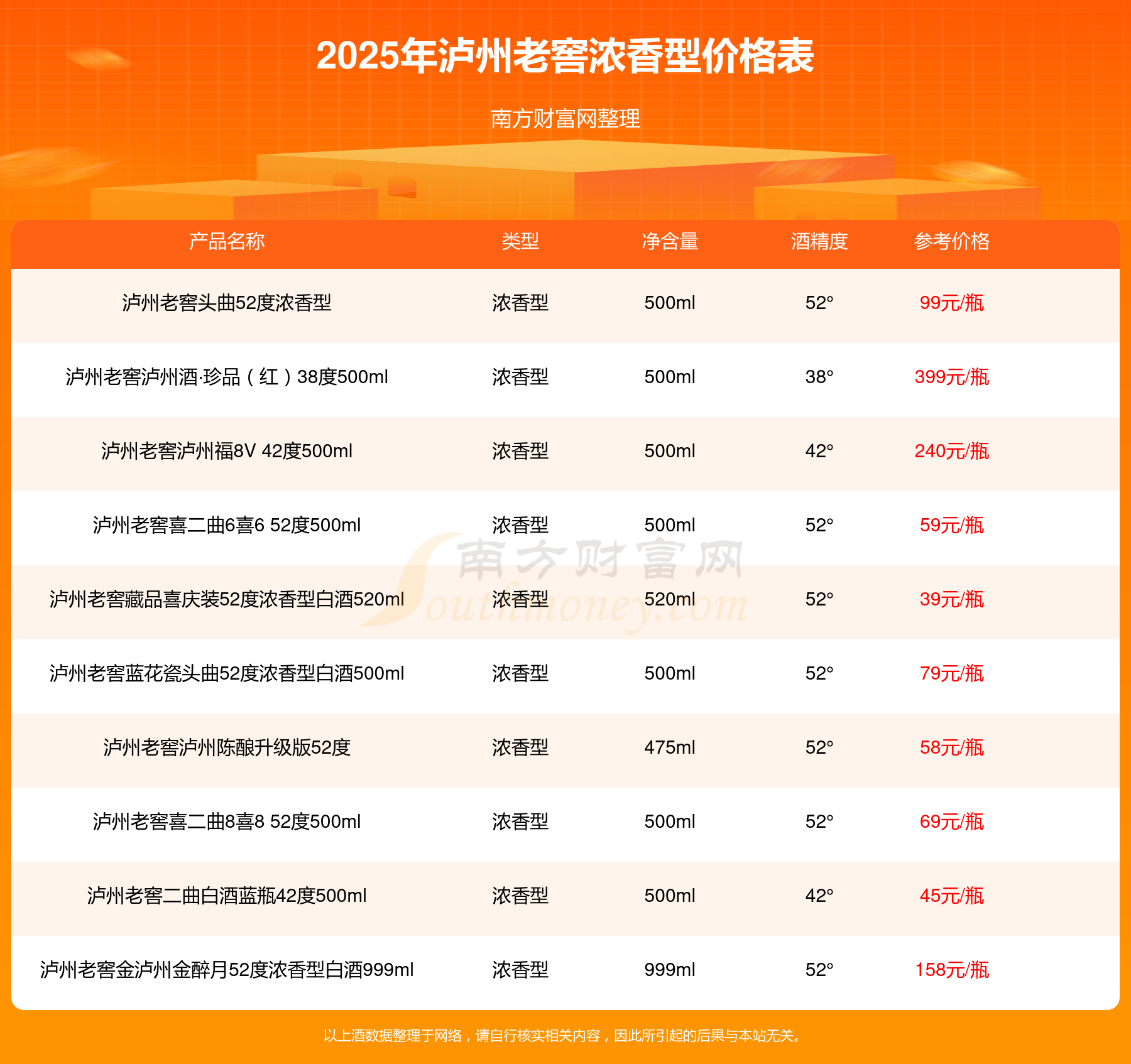 瀘州老窖濃香型酒最新價(jià)格2025:瀘州老窖國窖1573春釀鼠兆豐年E 55度參考價(jià)17999元/瓶、瀘州老窖國窖1573生命中的那壇酒55度014參考價(jià)9999元/瓶、瀘州老窖國窖1573春釀鼠兆豐年A 55度參考價(jià)5088元/瓶、瀘州老窖國窖1573生命中的那壇酒55度013濃香型白酒1000ml參考價(jià)4988元/瓶。