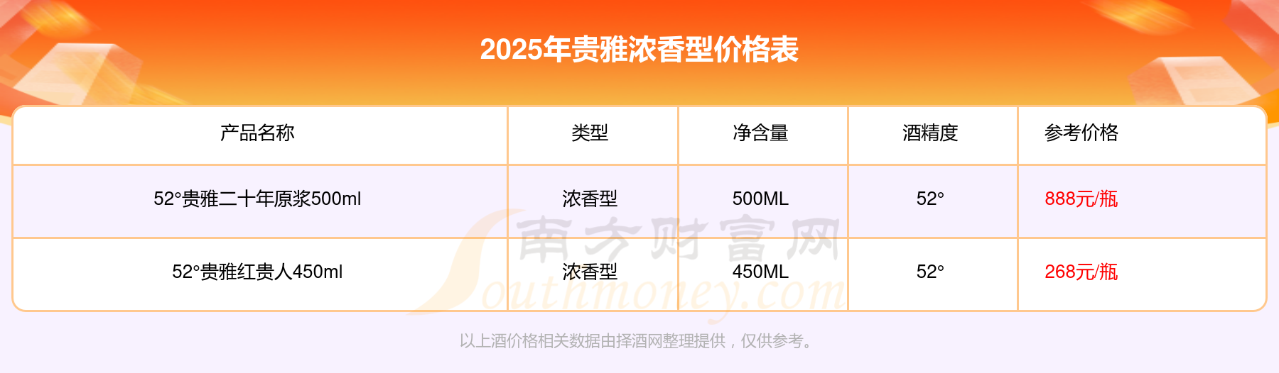 貴雅濃香型酒最新價(jià)格2025:52°貴雅二十年原漿500ml參考價(jià)888元/瓶、52°貴雅紅貴人450ml參考價(jià)268元/瓶。