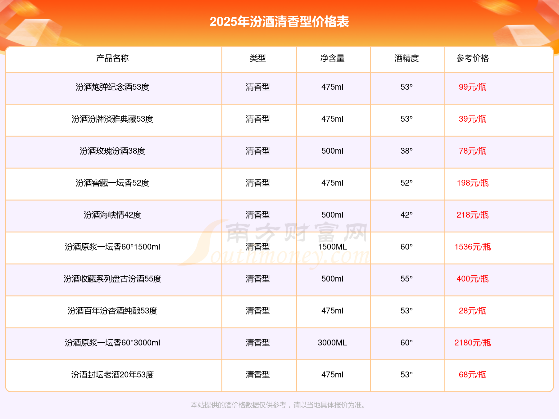 汾酒清香型酒最新價(jià)格2025:汾酒原漿一壇香60°3000ml參考價(jià)2180元/瓶、汾酒原漿一壇香60°1500ml參考價(jià)1536元/瓶、42度汾酒青花25參考價(jià)598元/瓶、汾酒收藏系列盤古汾酒55度參考價(jià)400元/瓶、汾酒關(guān)照原漿60度參考價(jià)399元/瓶。