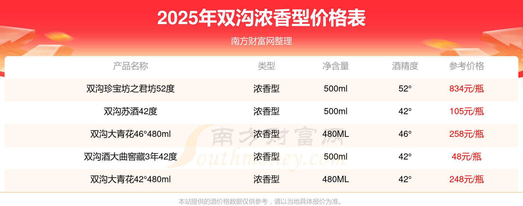 2025年,雙溝珍寶坊之君坊52度、雙溝大青花46°480ml、雙溝大青花42°480ml、雙溝蘇酒42度、雙溝酒大曲窖藏3年42度等雙溝濃香型酒價(jià)格如下:雙溝珍寶坊之君坊52度參考價(jià)834元/瓶、雙溝大青花46°480ml參考價(jià)258元/瓶、雙溝大青花42°480ml參考價(jià)248元/瓶、雙溝蘇酒42度參考價(jià)105元/瓶、雙溝酒大曲窖藏3年42度參考價(jià)48元/瓶。
