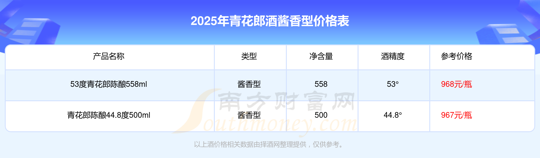 2025年青花郎酒醬香型酒53度青花郎陳釀558ml、青花郎陳釀44.8度500ml等最新價格如下: