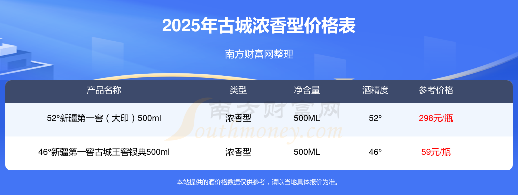 2025年古城濃香型酒52°新疆第一窖(大。500ml、46°新疆第一窖古城王窖銀典500ml等最新價(jià)格如下: