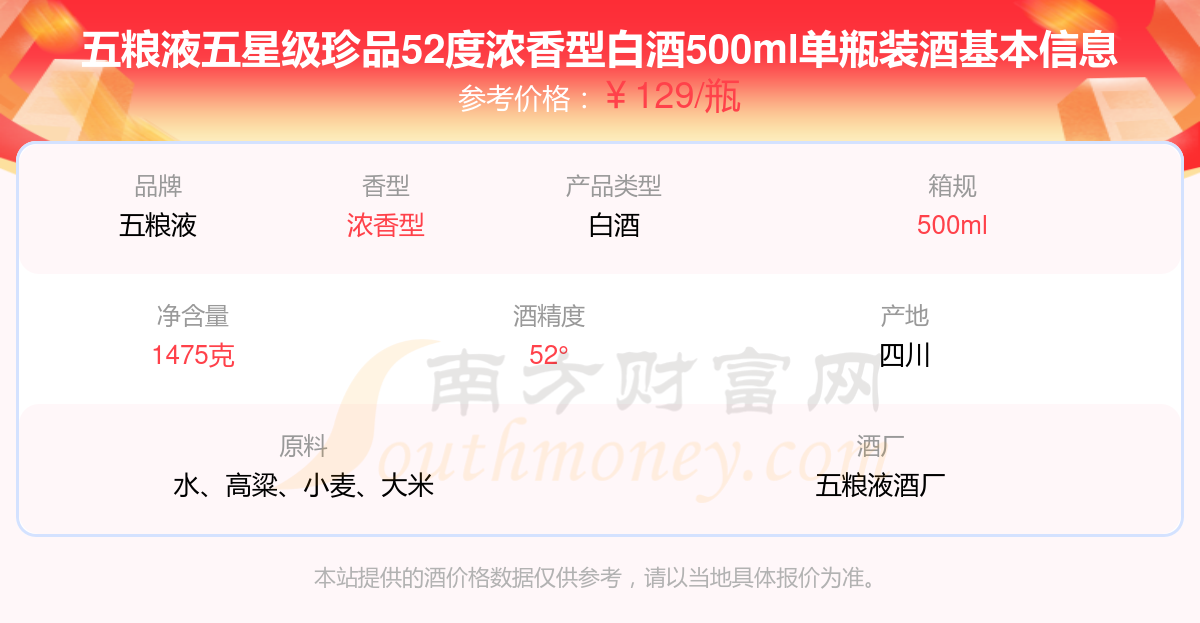五糧液五星級珍品52度濃香型白酒500ml單瓶裝基本信息