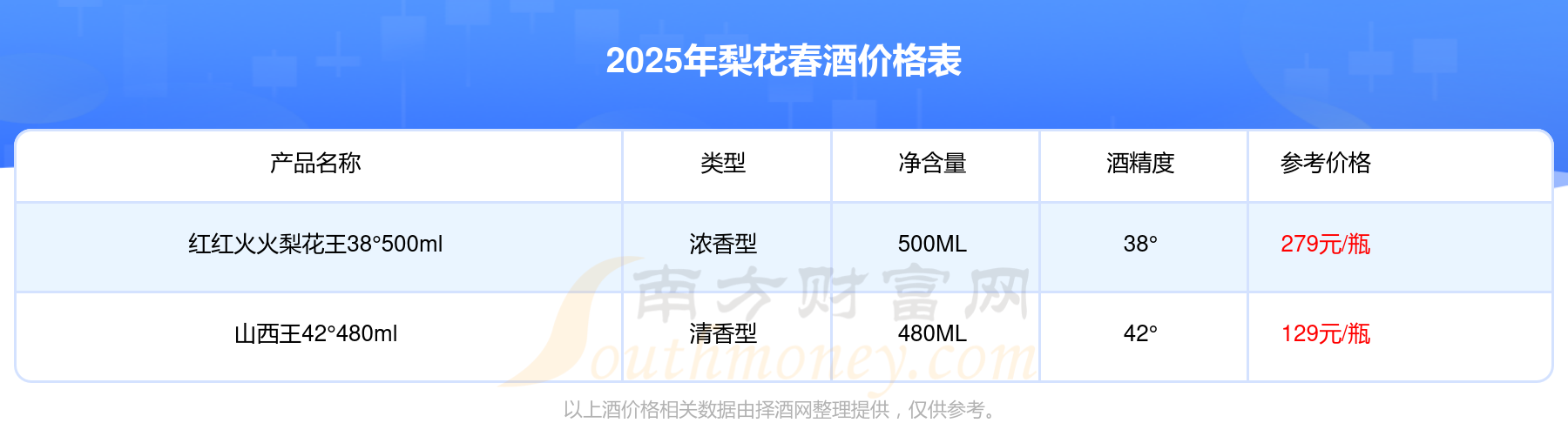 2025年,紅紅火火梨花王38°500ml、山西王42°480ml等梨花春酒價(jià)格如下: