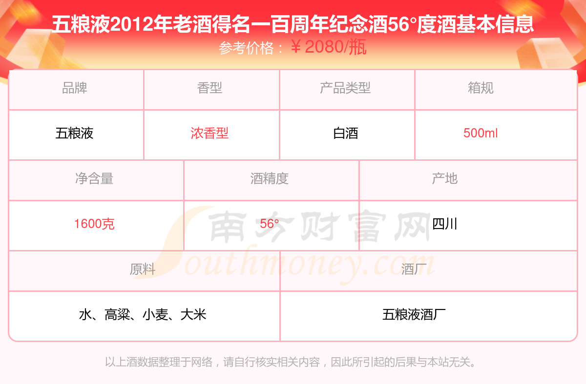 五糧液2012年老酒得名一百周年紀念酒56°度基本信息