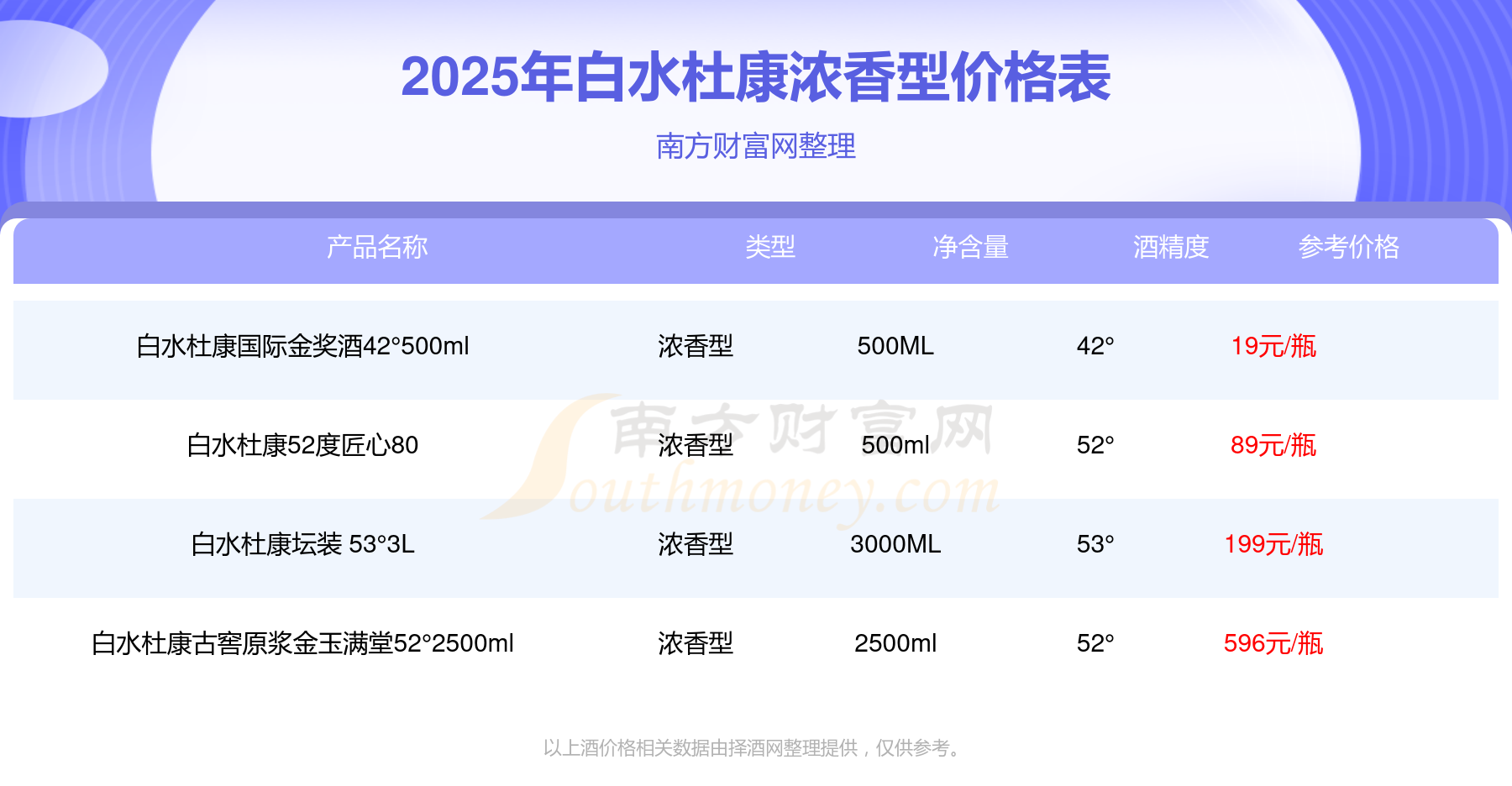 2025年,白水杜康古窖原漿金玉滿堂52°2500ml、白水杜康壇裝 53°3L、白水杜康52度匠心80、白水杜康國(guó)際金獎(jiǎng)酒42°500ml等白水杜康濃香型酒參考價(jià)格如下:白水杜康古窖原漿金玉滿堂52°2500ml參考價(jià)596元、白水杜康壇裝 53°3L參考價(jià)199元、白水杜康52度匠心80參考價(jià)89元、白水杜康國(guó)際金獎(jiǎng)酒42°500ml參考價(jià)19元。