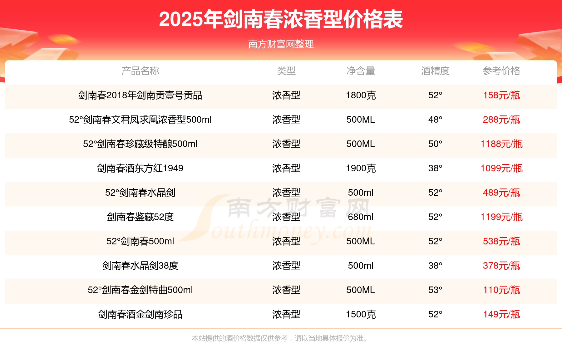 劍南春鑒藏52度參考價1199元/瓶、52°劍南春珍藏級特釀500ml參考價1188元/瓶、劍南春酒東方紅1949參考價1099元/瓶、52°劍南春500ml參考價538元/瓶、52°劍南春水晶劍參考價489元/瓶。