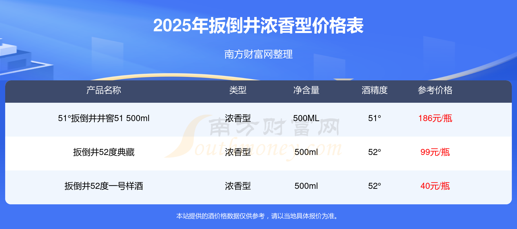 2025扳倒井濃香型酒最新價格:51°扳倒井井窖51 500ml參考價186元/瓶、扳倒井52度典藏參考價99元/瓶、扳倒井52度一號樣酒參考價40元/瓶。