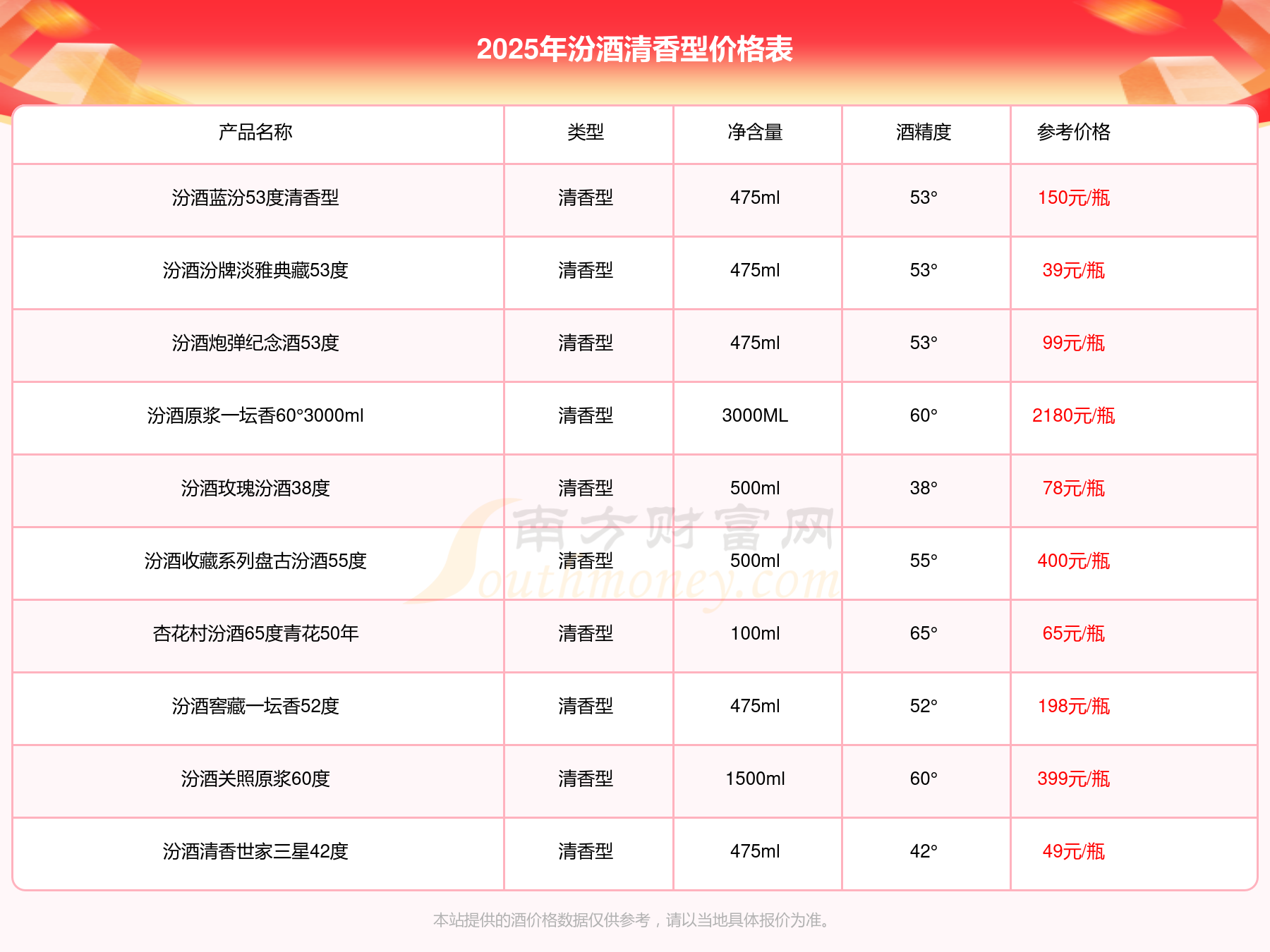 2025年,汾酒清香型酒價(jià)格最高的是汾酒原漿一壇香60°3000ml,參考價(jià)2180元,最低的是汾酒百年汾杏酒純釀53度,參考價(jià)28元,價(jià)格高低差為2152元。