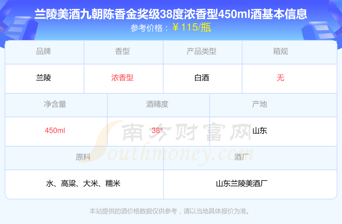 蘭陵美酒九朝陳香金獎級38度濃香型450ml基本信息