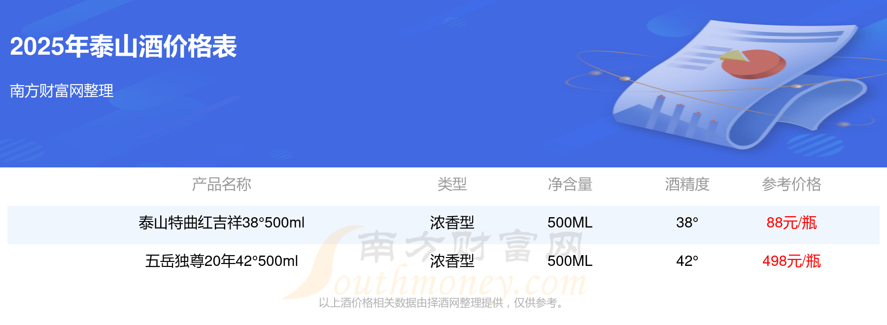 2025年泰山酒五岳獨(dú)尊20年42°500ml、泰山特曲紅吉祥38°500ml等最新價(jià)格如下: