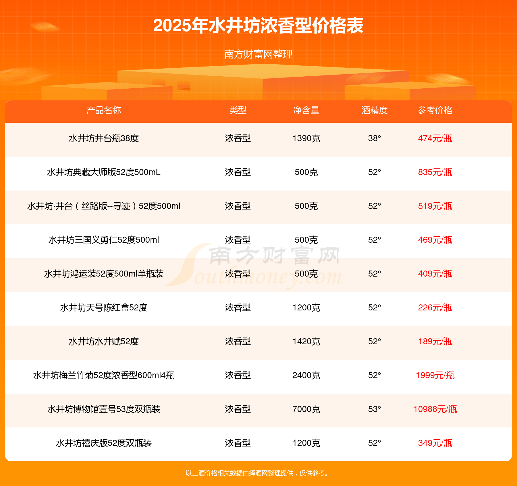 2025水井坊濃香型酒最新價(jià)格:水井坊大壇收藏級(jí)原漿天球瓶66度參考價(jià)13999元/瓶、水井坊博物館壹號(hào)53度雙瓶裝參考價(jià)10988元/瓶、53°水井坊公元十三600ml參考價(jià)2580元/瓶、水井坊梅蘭竹菊52度濃香型600ml4瓶參考價(jià)1999元/瓶。
