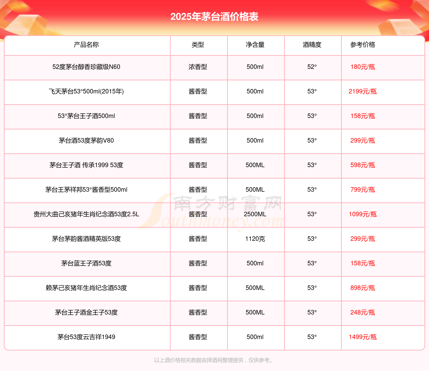 2025年茅臺酒華茅鑒藏 醬香型白酒 3L 53°、53度五星茅臺生肖酒丁酉雞年、貴州茅臺己亥豬年生肖酒53°500ml、53度五星茅臺生肖酒戊戌狗年、飛天茅臺53°500ml(2015年)、茅臺王子酒己亥豬年生肖紀(jì)念酒53度2.5L等最新價格如下: