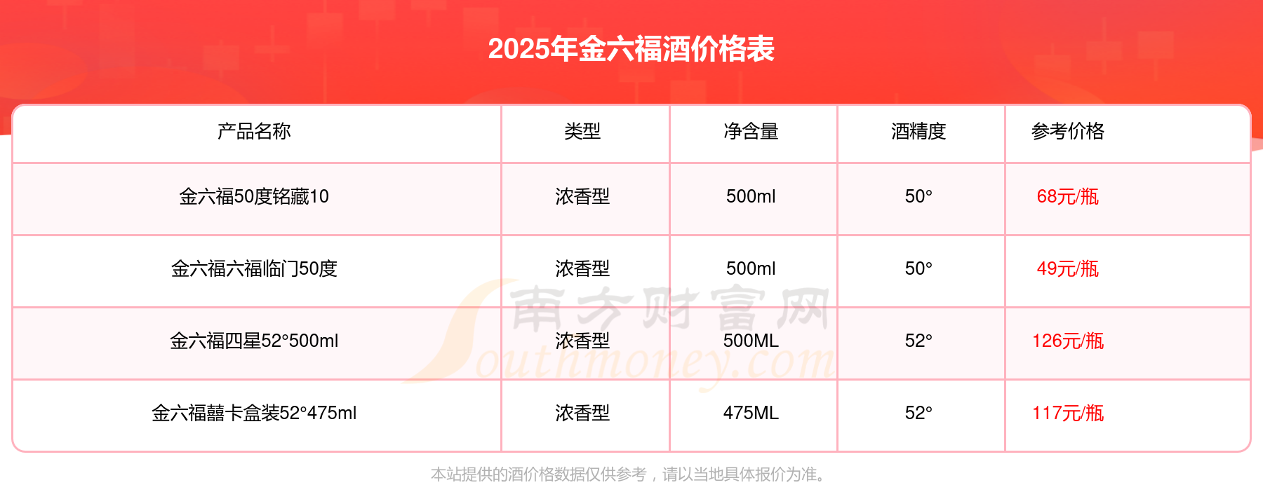 金六福四星52°500ml參考價(jià)126元/瓶、金六福囍卡盒裝52°475ml參考價(jià)117元/瓶、金六福50度銘藏10參考價(jià)68元/瓶。