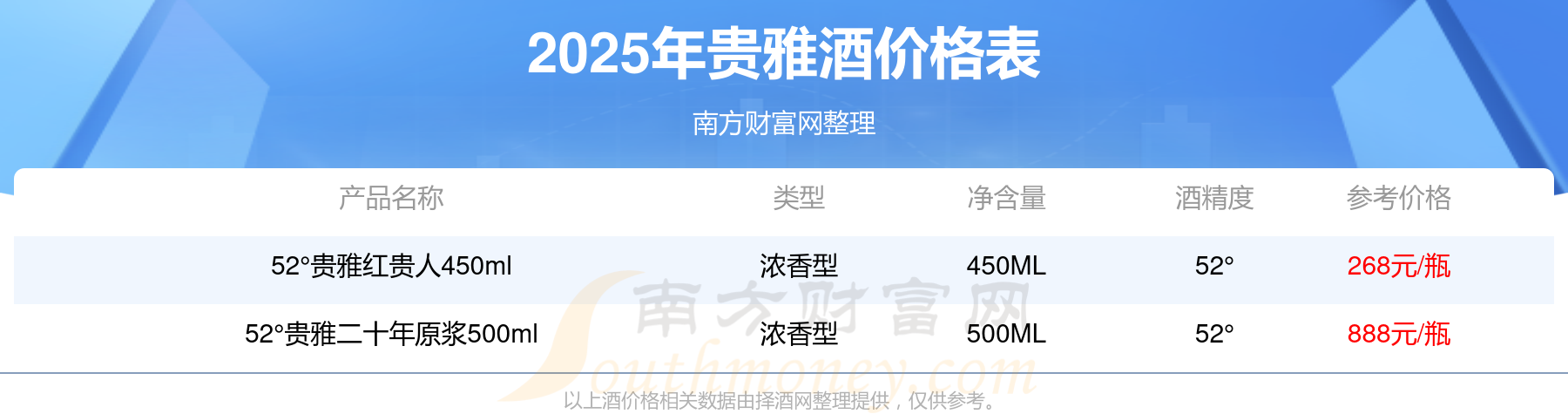 貴雅酒最新價(jià)格2025:52°貴雅二十年原漿500ml參考價(jià)888元/瓶、52°貴雅紅貴人450ml參考價(jià)268元/瓶。
