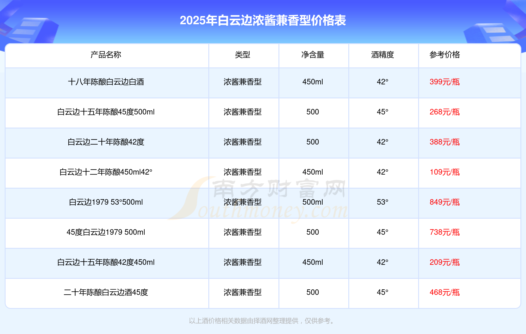 2025年白云邊濃醬兼香型酒白云邊1979 53°500ml、45度白云邊1979 500ml、二十年陳釀白云邊酒45度、十八年陳釀白云邊白酒、白云邊二十年陳釀42度、白云邊十五年陳釀45度500ml等最新價(jià)格如下:白云邊1979 53°500ml參考價(jià)849元/瓶、45度白云邊1979 500ml參考價(jià)738元/瓶、二十年陳釀白云邊酒45度參考價(jià)468元/瓶、十八年陳釀白云邊白酒參考價(jià)399元/瓶、白云邊二十年陳釀42度參考價(jià)388元/瓶、白云邊十五年陳釀45度500ml參考價(jià)268元/瓶。