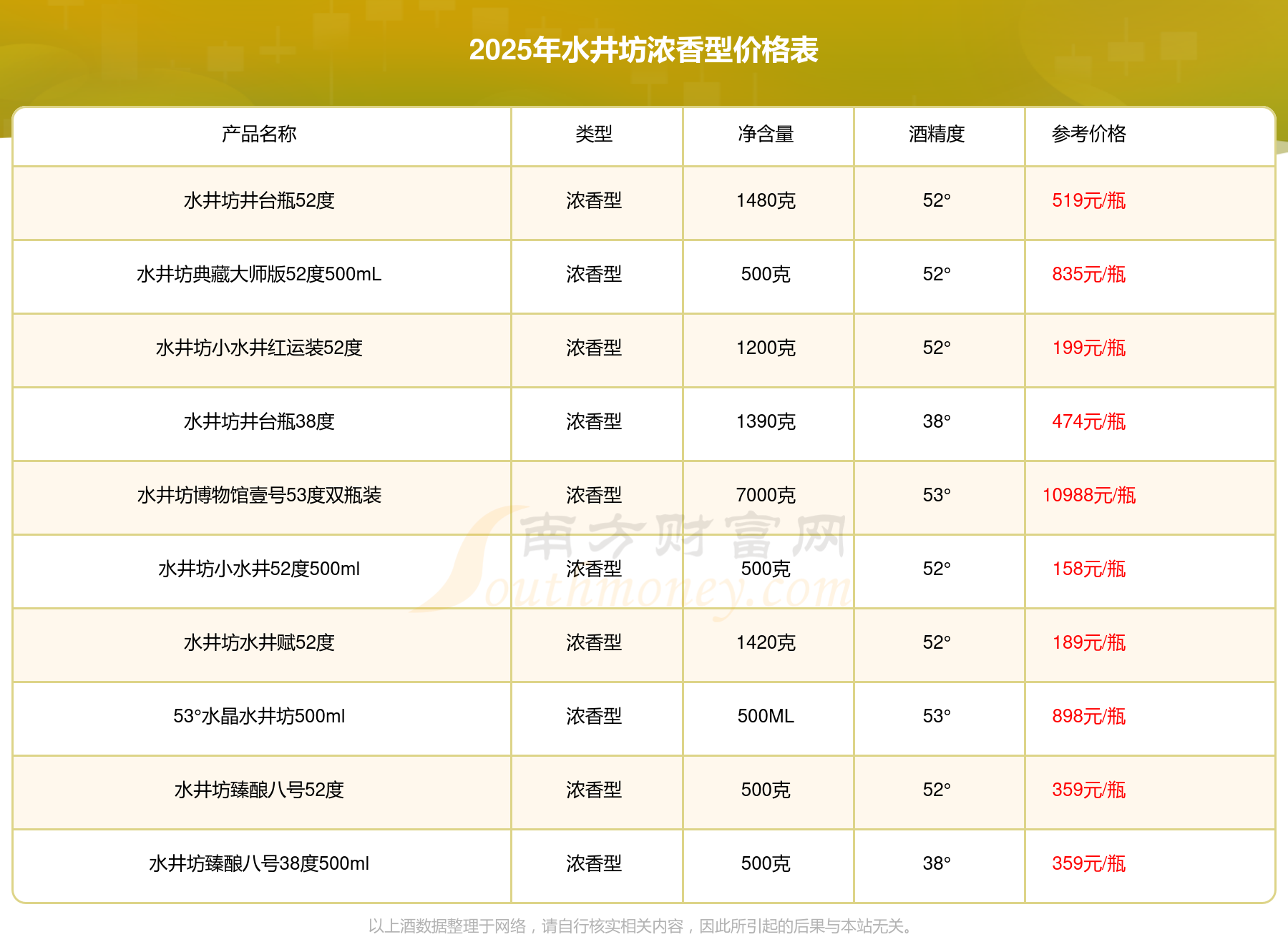 水井坊大壇收藏級(jí)原漿天球瓶66度參考價(jià)13999元/瓶、水井坊博物館壹號(hào)53度雙瓶裝參考價(jià)10988元/瓶、53°水井坊公元十三600ml參考價(jià)2580元/瓶、水井坊梅蘭竹菊52度濃香型600ml4瓶參考價(jià)1999元/瓶、水井坊菁翠52度500ml參考價(jià)1650元/瓶、井臺(tái)珍藏版龍53度1000ml單瓶裝參考價(jià)1298元/瓶。