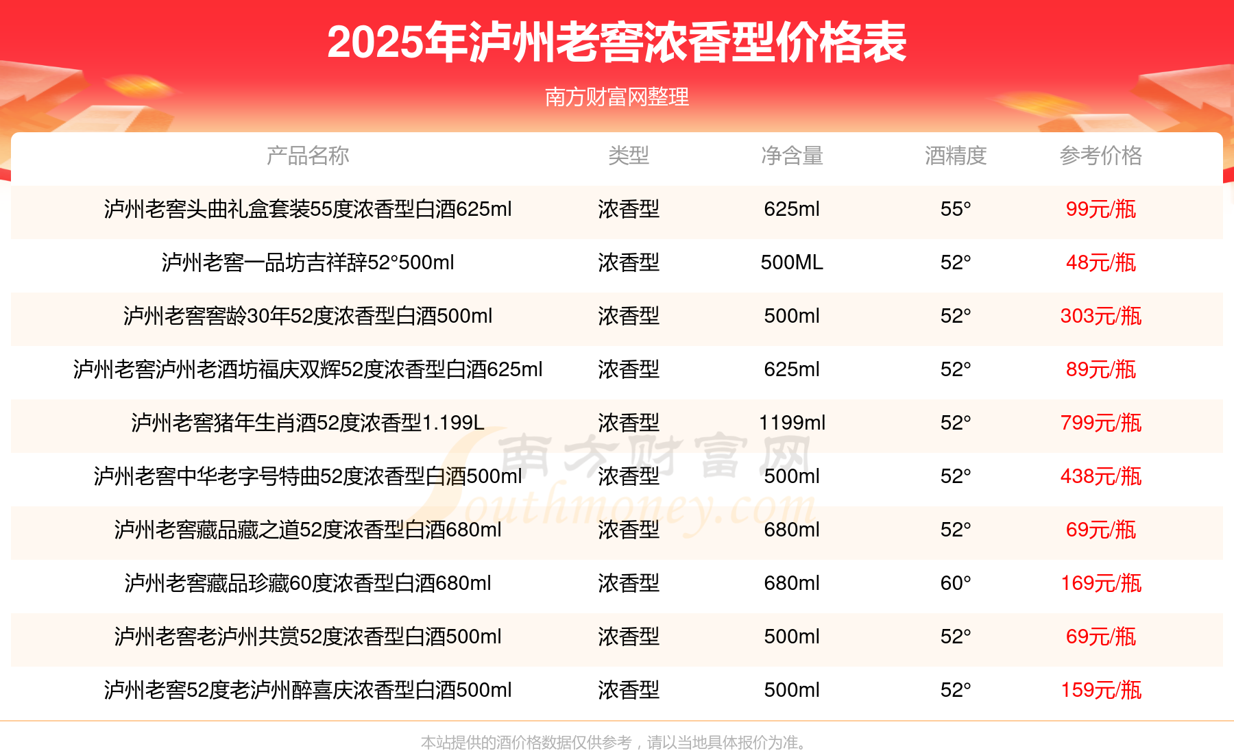 2025年,瀘州老窖國(guó)窖1573春釀鼠兆豐年E 55度、瀘州老窖國(guó)窖1573生命中的那壇酒55度014、瀘州老窖國(guó)窖1573春釀鼠兆豐年A 55度、瀘州老窖國(guó)窖1573生命中的那壇酒55度013濃香型白酒1000ml、瀘州老窖國(guó)窖1573生命中的那壇酒55度009 1000ml、瀘州老窖國(guó)窖1573中國(guó)品味52度濃香型白酒500ml、瀘州老窖國(guó)窖1573許燎源概念作品58度濃香型白酒1000ml等瀘州老窖濃香型酒參考價(jià)格如下:瀘州老窖國(guó)窖1573春釀鼠兆豐年E 55度參考價(jià)17999元、瀘州老窖國(guó)窖1573生命中的那壇酒55度014參考價(jià)9999元、瀘州老窖國(guó)窖1573春釀鼠兆豐年A 55度參考價(jià)5088元、瀘州老窖國(guó)窖1573生命中的那壇酒55度013濃香型白酒1000ml參考價(jià)4988元、瀘州老窖國(guó)窖1573生命中的那壇酒55度009 1000ml參考價(jià)4288元、瀘州老窖國(guó)窖1573中國(guó)品味52度濃香型白酒500ml參考價(jià)2888元、瀘州老窖國(guó)窖1573許燎源概念作品58度濃香型白酒1000ml參考價(jià)2680元。