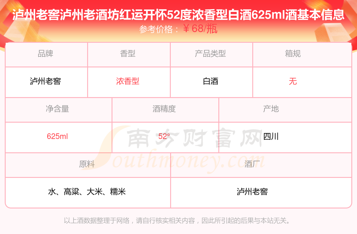 瀘州老窖瀘州老酒坊紅運開懷52度濃香型白酒625ml基本信息