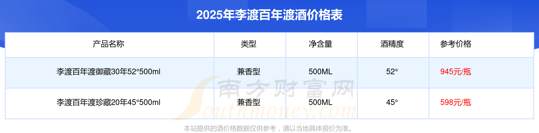 李渡百年渡御藏30年52°500ml參考價945元/瓶、李渡百年渡珍藏20年45°500ml參考價598元/瓶。