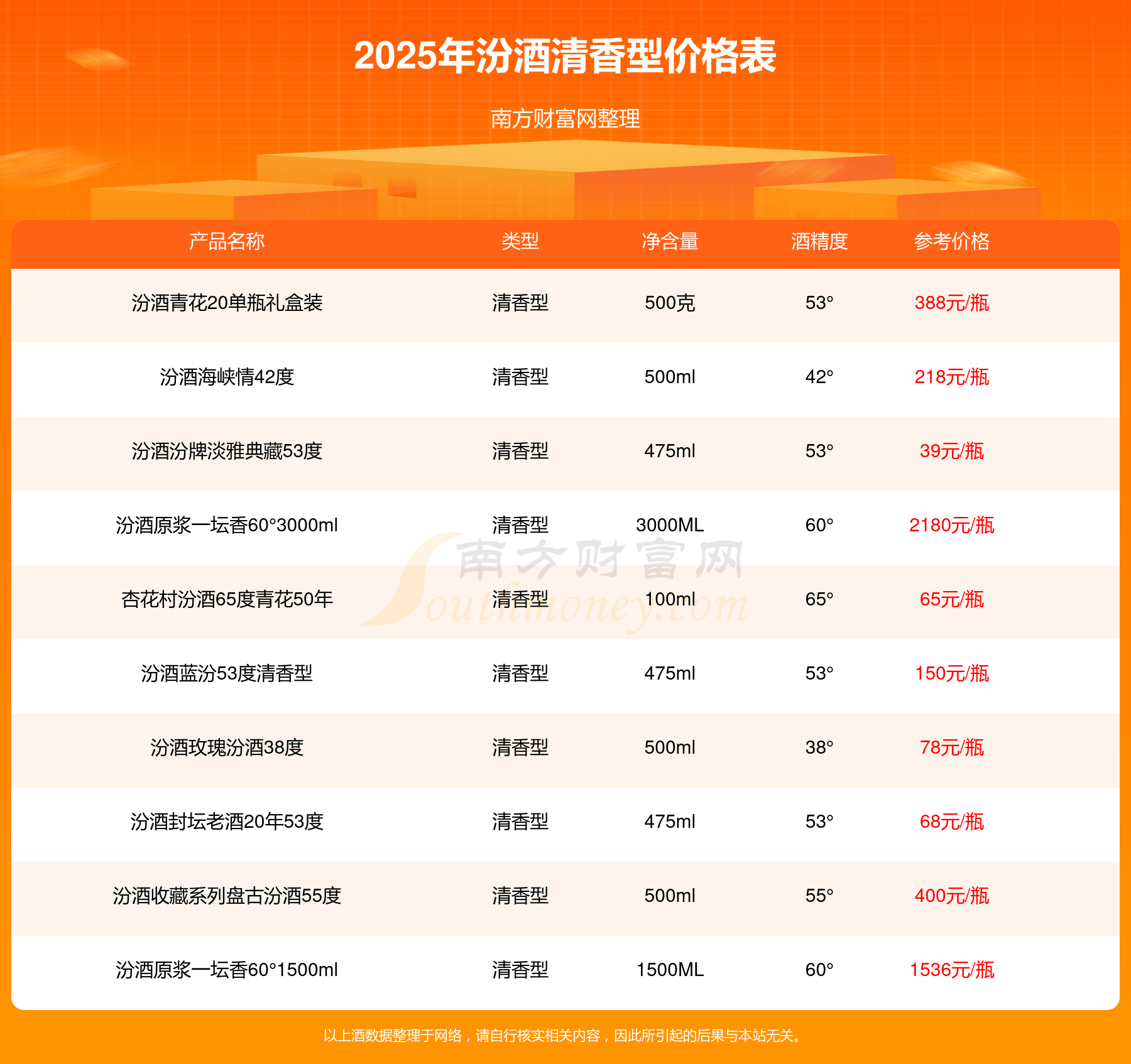 2025年汾酒清香型酒汾酒原漿一壇香60°3000ml、汾酒原漿一壇香60°1500ml、42度汾酒青花25、汾酒收藏系列盤古汾酒55度、汾酒關照原漿60度、汾酒青花20單瓶禮盒裝、汾酒海峽情42度等最新價格如下:汾酒原漿一壇香60°3000ml參考價2180元/瓶、汾酒原漿一壇香60°1500ml參考價1536元/瓶、42度汾酒青花25參考價598元/瓶、汾酒收藏系列盤古汾酒55度參考價400元/瓶、汾酒關照原漿60度參考價399元/瓶、汾酒青花20單瓶禮盒裝參考價388元/瓶、汾酒海峽情42度參考價218元/瓶。