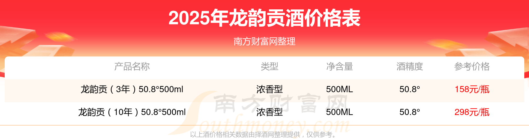 2025年龍韻貢酒龍韻貢(10年)50.8°500ml、龍韻貢(3年)50.8°500ml等最新價(jià)格如下: