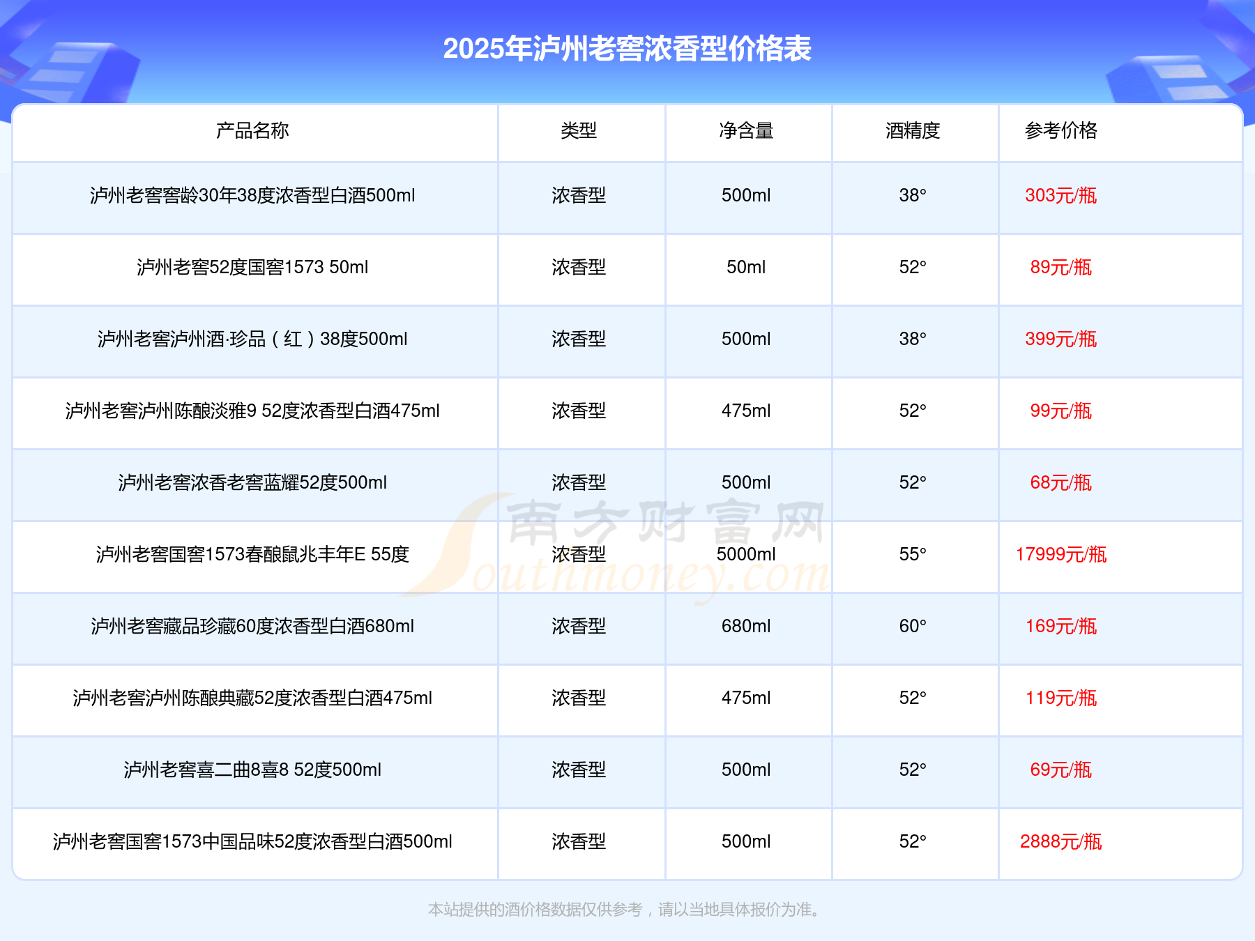 2025年,瀘州老窖國(guó)窖1573春釀鼠兆豐年E 55度、瀘州老窖國(guó)窖1573生命中的那壇酒55度014、瀘州老窖國(guó)窖1573春釀鼠兆豐年A 55度、瀘州老窖國(guó)窖1573生命中的那壇酒55度013濃香型白酒1000ml等瀘州老窖濃香型酒價(jià)格如下:瀘州老窖國(guó)窖1573春釀鼠兆豐年E 55度參考價(jià)17999元/瓶、瀘州老窖國(guó)窖1573生命中的那壇酒55度014參考價(jià)9999元/瓶、瀘州老窖國(guó)窖1573春釀鼠兆豐年A 55度參考價(jià)5088元/瓶、瀘州老窖國(guó)窖1573生命中的那壇酒55度013濃香型白酒1000ml參考價(jià)4988元/瓶。