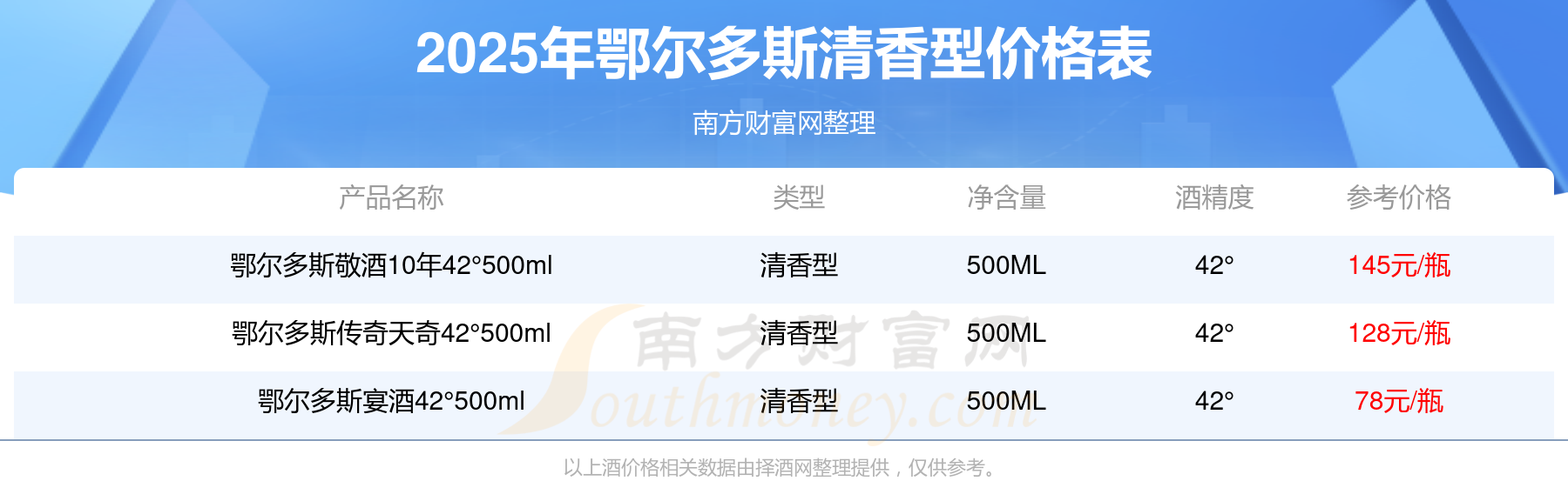 2025年鄂爾多斯清香型酒鄂爾多斯敬酒10年42°500ml、鄂爾多斯傳奇天奇42°500ml、鄂爾多斯宴酒42°500ml等最新價(jià)格如下:鄂爾多斯敬酒10年42°500ml參考價(jià)145元/瓶、鄂爾多斯傳奇天奇42°500ml參考價(jià)128元/瓶、鄂爾多斯宴酒42°500ml參考價(jià)78元/瓶。