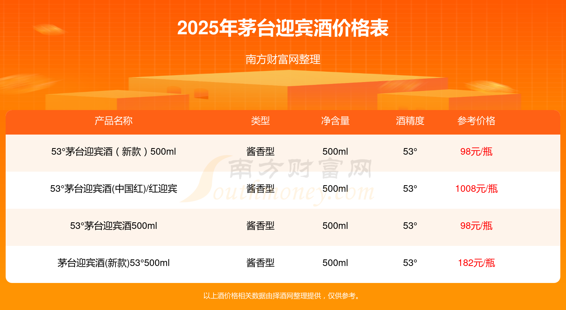 53°茅臺迎賓酒(中國紅)/紅迎賓參考價1008元/瓶、茅臺迎賓酒(新款)53°500ml參考價182元/瓶、53°茅臺迎賓酒(新款)500ml參考價98元/瓶、53°茅臺迎賓酒500ml參考價98元/瓶。