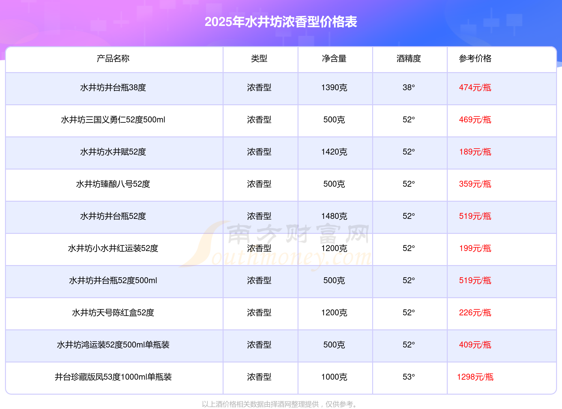 2025水井坊濃香型酒最新價(jià)格:水井坊大壇收藏級(jí)原漿天球瓶66度參考價(jià)13999元/瓶、水井坊博物館壹號(hào)53度雙瓶裝參考價(jià)10988元/瓶、53°水井坊公元十三600ml參考價(jià)2580元/瓶、水井坊梅蘭竹菊52度濃香型600ml4瓶參考價(jià)1999元/瓶、水井坊菁翠52度500ml參考價(jià)1650元/瓶、井臺(tái)珍藏版龍53度1000ml單瓶裝參考價(jià)1298元/瓶。