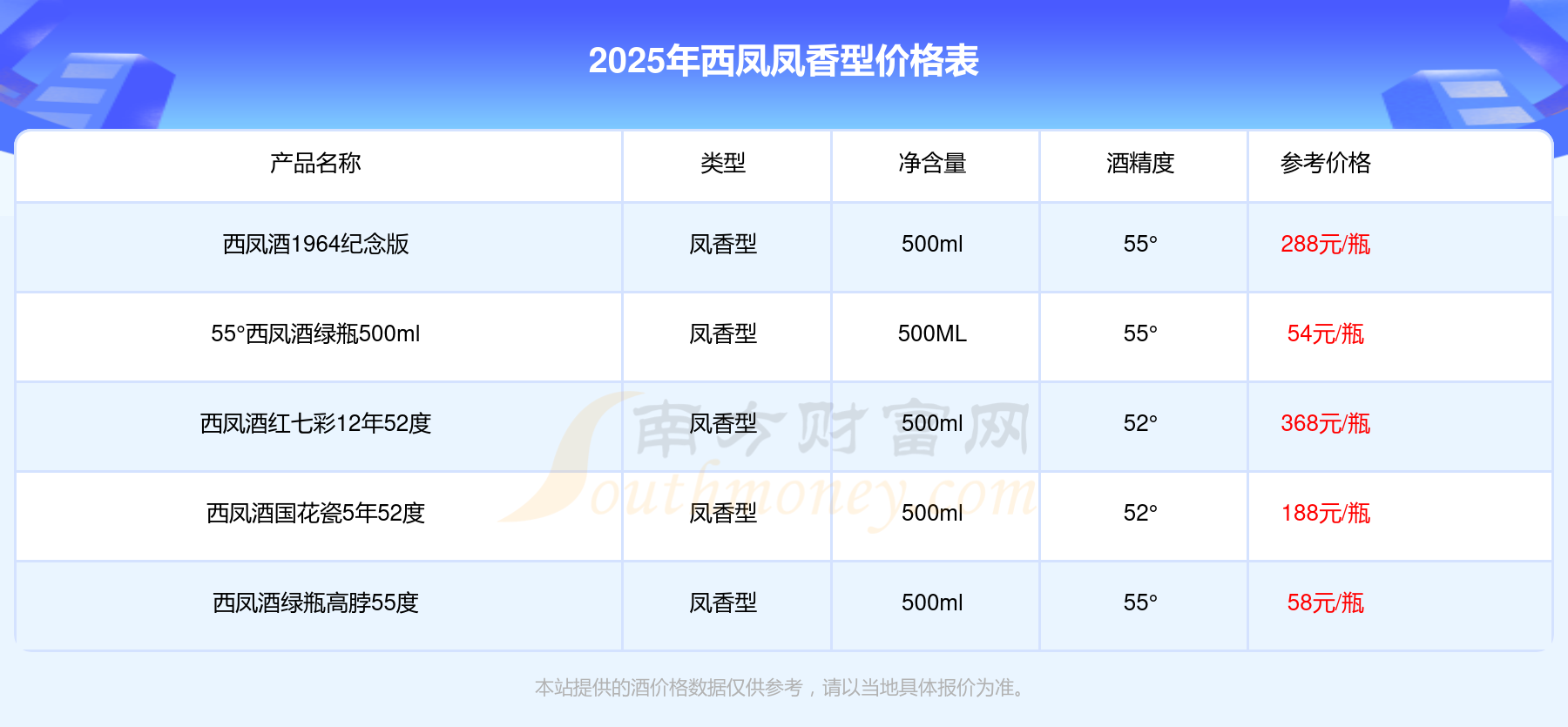 2025年,西鳳酒紅七彩12年52度、西鳳酒1964紀(jì)念版、西鳳酒國花瓷5年52度、西鳳酒綠瓶高脖55度、55°西鳳酒綠瓶500ml等西鳳鳳香型酒價格如下:西鳳酒紅七彩12年52度參考價368元/瓶、西鳳酒1964紀(jì)念版參考價288元/瓶、西鳳酒國花瓷5年52度參考價188元/瓶、西鳳酒綠瓶高脖55度參考價58元/瓶、55°西鳳酒綠瓶500ml參考價54元/瓶。