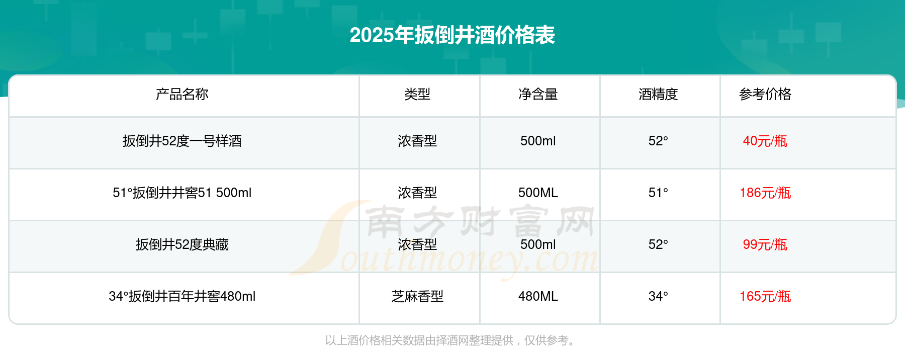 2025年扳倒井酒51°扳倒井井窖51 500ml、34°扳倒井百年井窖480ml、扳倒井52度典藏等最新價格如下:51°扳倒井井窖51 500ml參考價186元/瓶、34°扳倒井百年井窖480ml參考價165元/瓶、扳倒井52度典藏參考價99元/瓶。