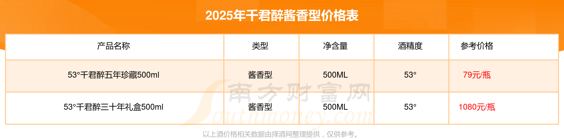 2025年千君醉醬香型酒53°千君醉三十年禮盒500ml、53°千君醉五年珍藏500ml等最新價格如下: