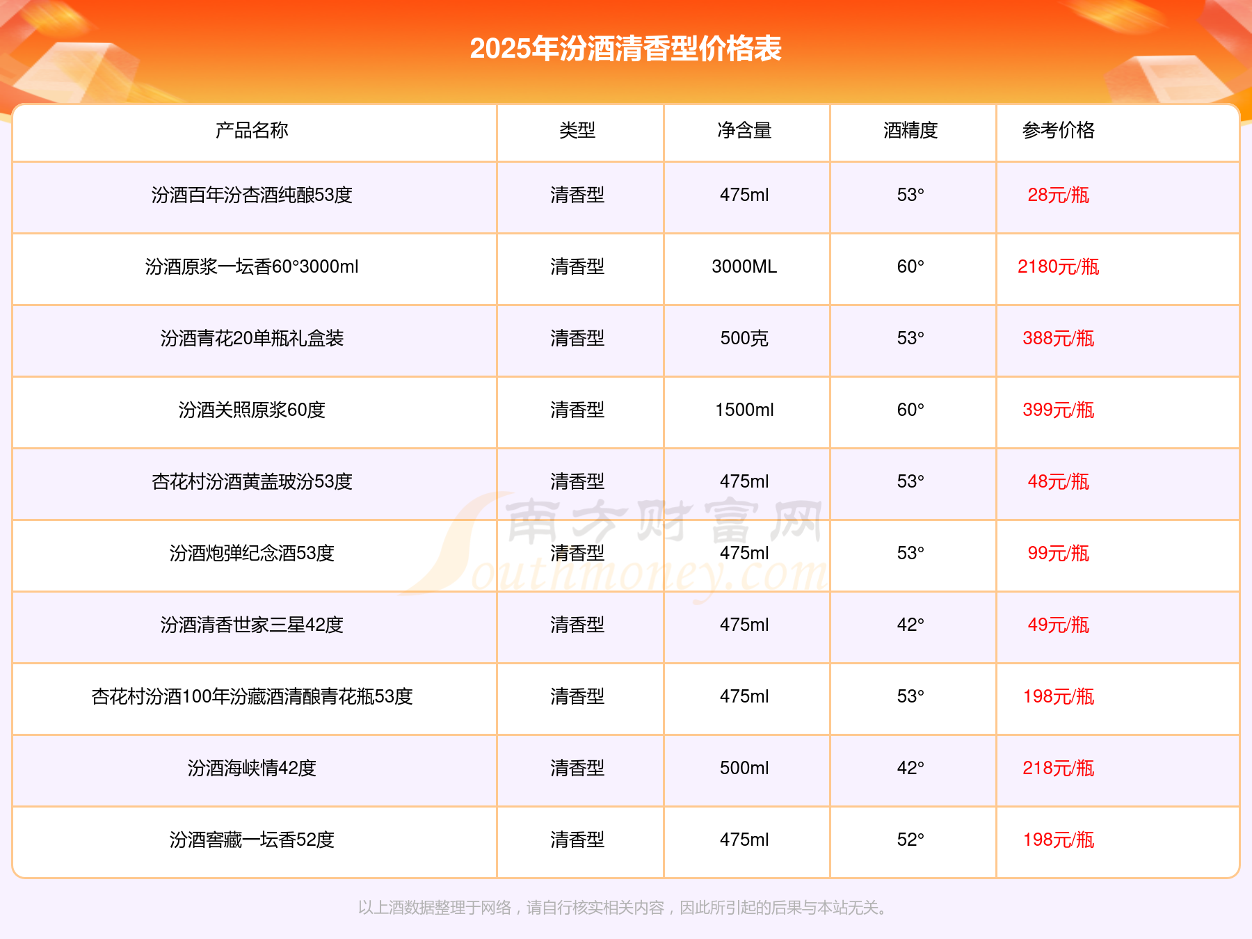 汾酒清香型酒價格最高的是汾酒原漿一壇香60°3000ml,參考價2180元/瓶,最低的是汾酒百年汾杏酒純釀53度,參考價28元/瓶,價格高低差為2152元/瓶。