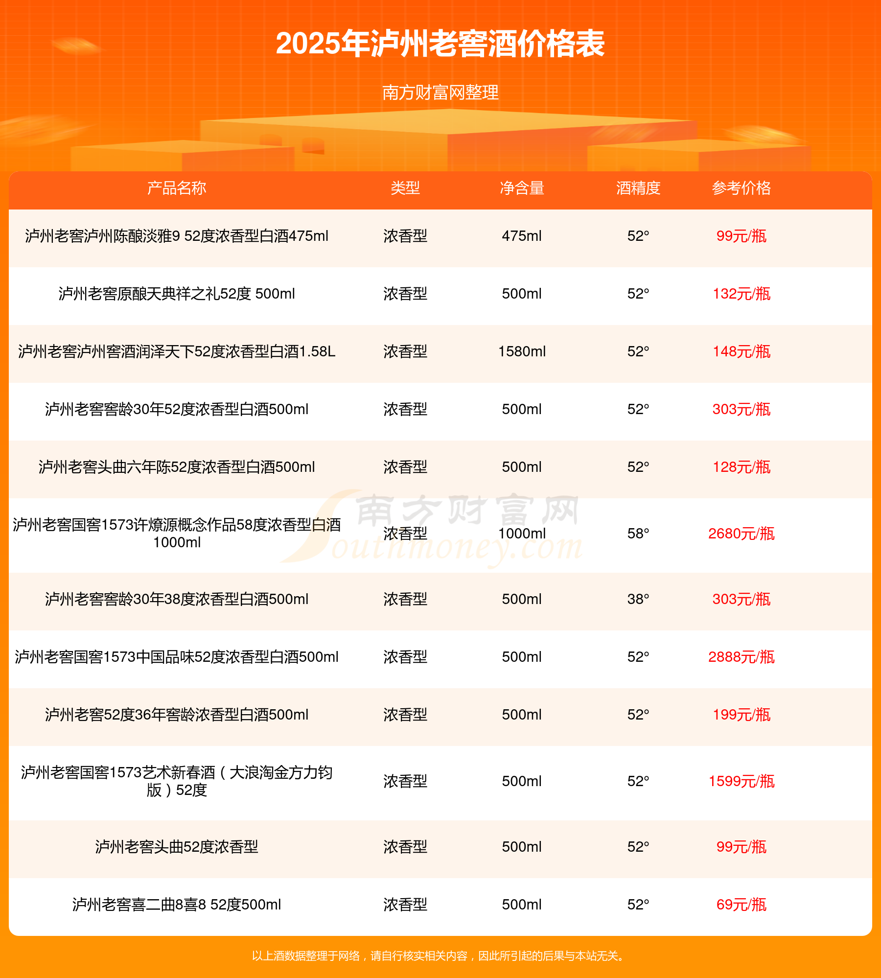 瀘州老窖國(guó)窖1573春釀鼠兆豐年E 55度參考價(jià)17999元/瓶、瀘州老窖國(guó)窖1573生命中的那壇酒55度014參考價(jià)9999元/瓶、瀘州老窖國(guó)窖1573春釀鼠兆豐年A 55度參考價(jià)5088元/瓶、瀘州老窖國(guó)窖1573生命中的那壇酒55度013濃香型白酒1000ml參考價(jià)4988元/瓶。