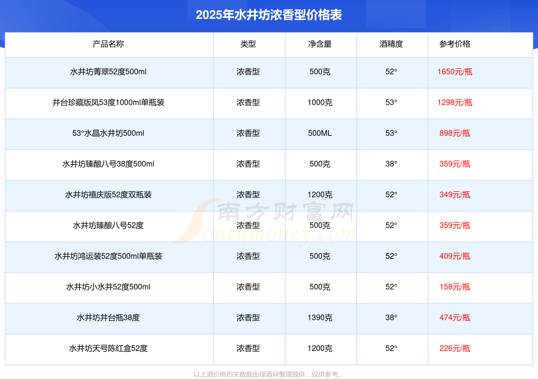 2025年水井坊濃香型價格最高的酒是水井坊大壇收藏級原漿天球瓶66度,參考價13999元/瓶,最低的是水井坊小水井52度500ml,參考價158元/瓶,價格高低差為13841元/瓶。