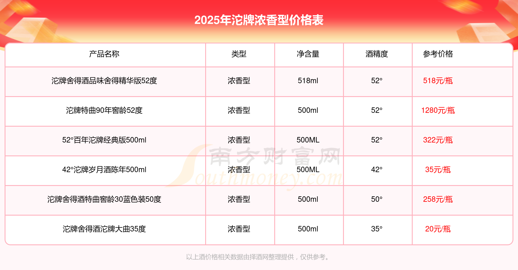 2025年沱牌濃香型價(jià)格最高的酒是沱牌特曲90年窖齡52度,參考價(jià)1280元/瓶,最低的是沱牌舍得酒沱牌大曲35度,參考價(jià)20元/瓶,價(jià)格高低差為1260元/瓶。