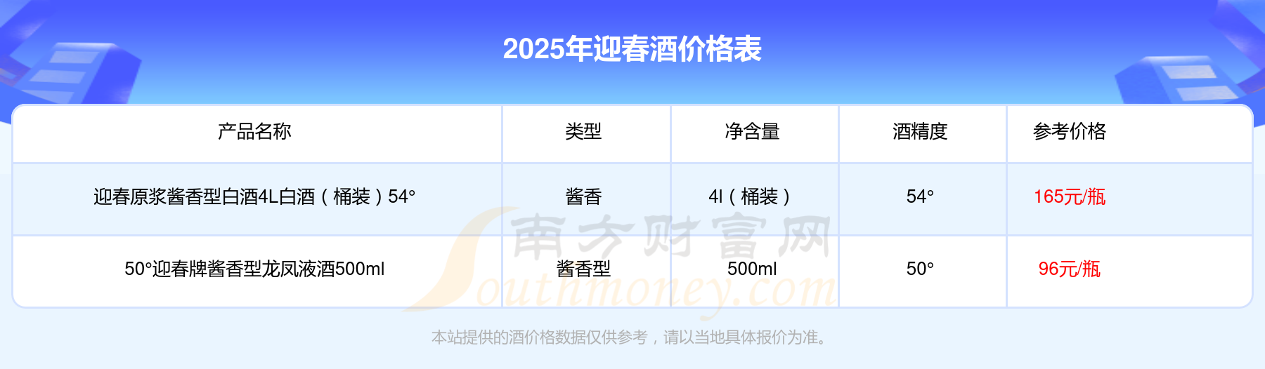 2025迎春酒最新價格:迎春原漿醬香型白酒4L白酒(桶裝)54°參考價165元/瓶、50°迎春牌醬香型龍鳳液酒500ml參考價96元/瓶。