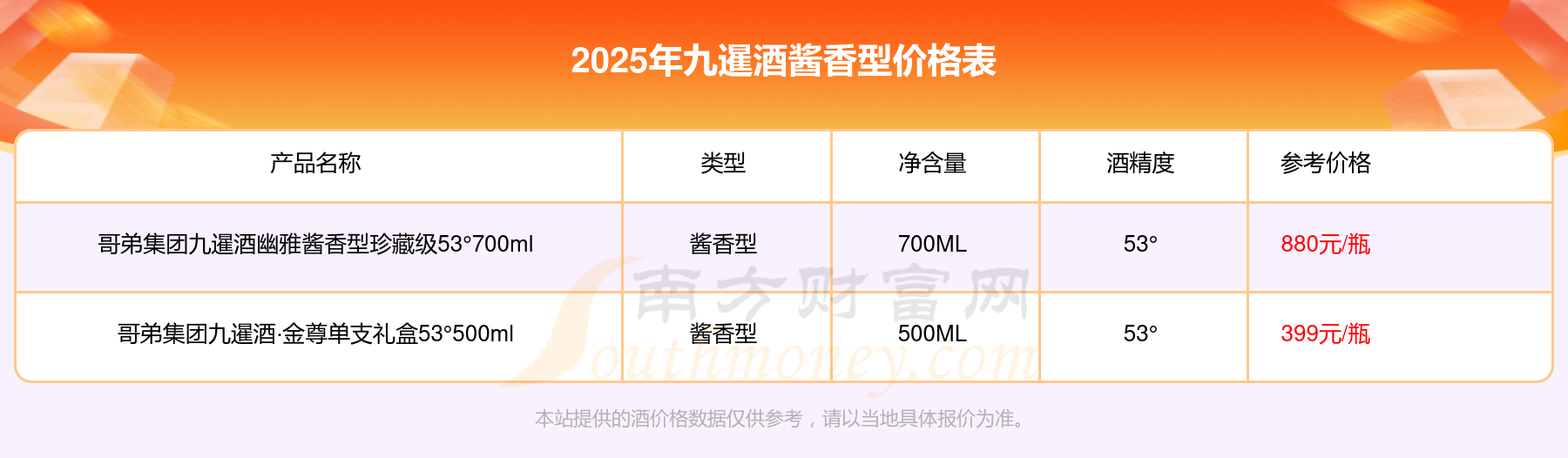 哥弟集團(tuán)九暹酒幽雅醬香型珍藏級53°700ml參考價880元/瓶、哥弟集團(tuán)九暹酒·金尊單支禮盒53°500ml參考價399元/瓶。