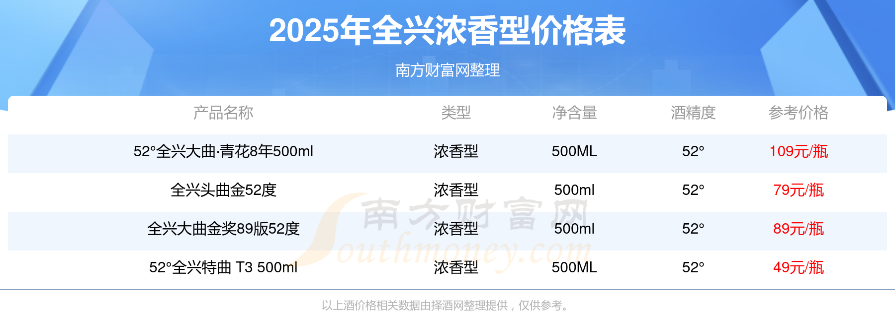 2025年全興濃香型酒52°全興大曲·青花8年500ml、全興大曲金獎(jiǎng)89版52度、全興頭曲金52度、52°全興特曲 T3 500ml等最新價(jià)格如下: