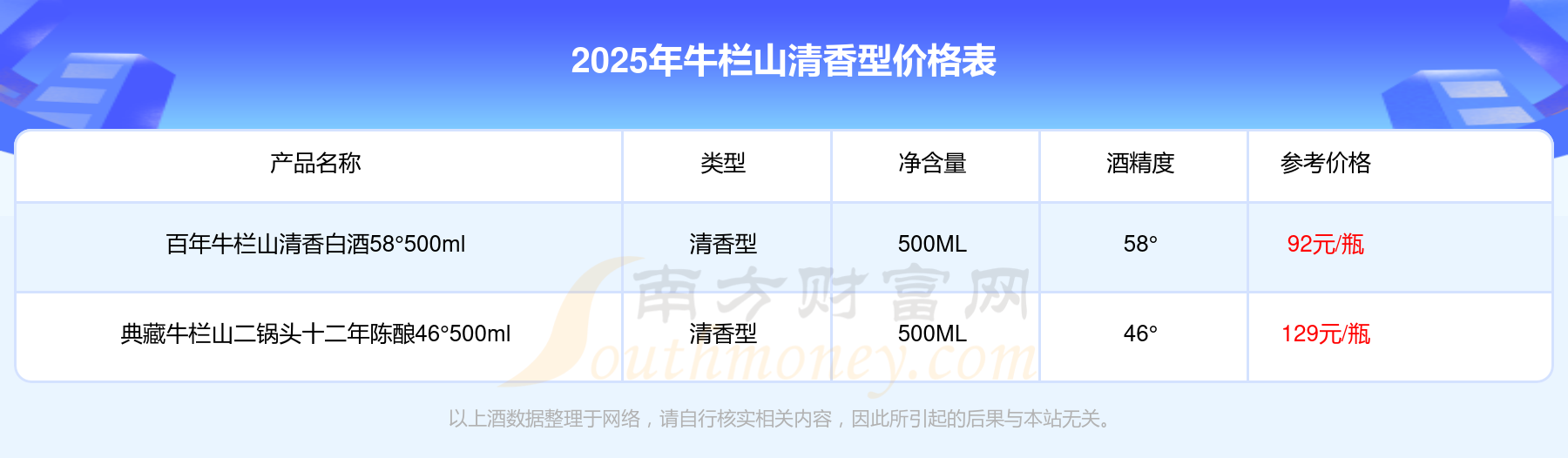 2025牛欄山清香型酒最新價格:典藏牛欄山二鍋頭十二年陳釀46°500ml參考價129元/瓶、百年牛欄山清香白酒58°500ml參考價92元/瓶。