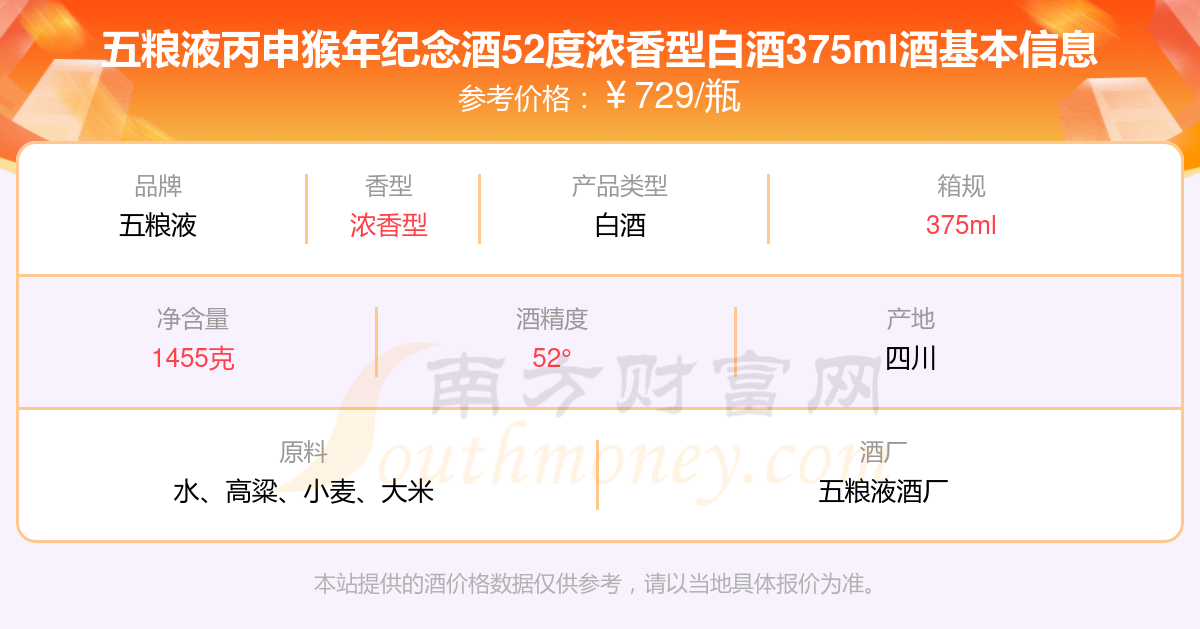 五糧液丙申猴年紀念酒52度濃香型白酒375ml基本信息