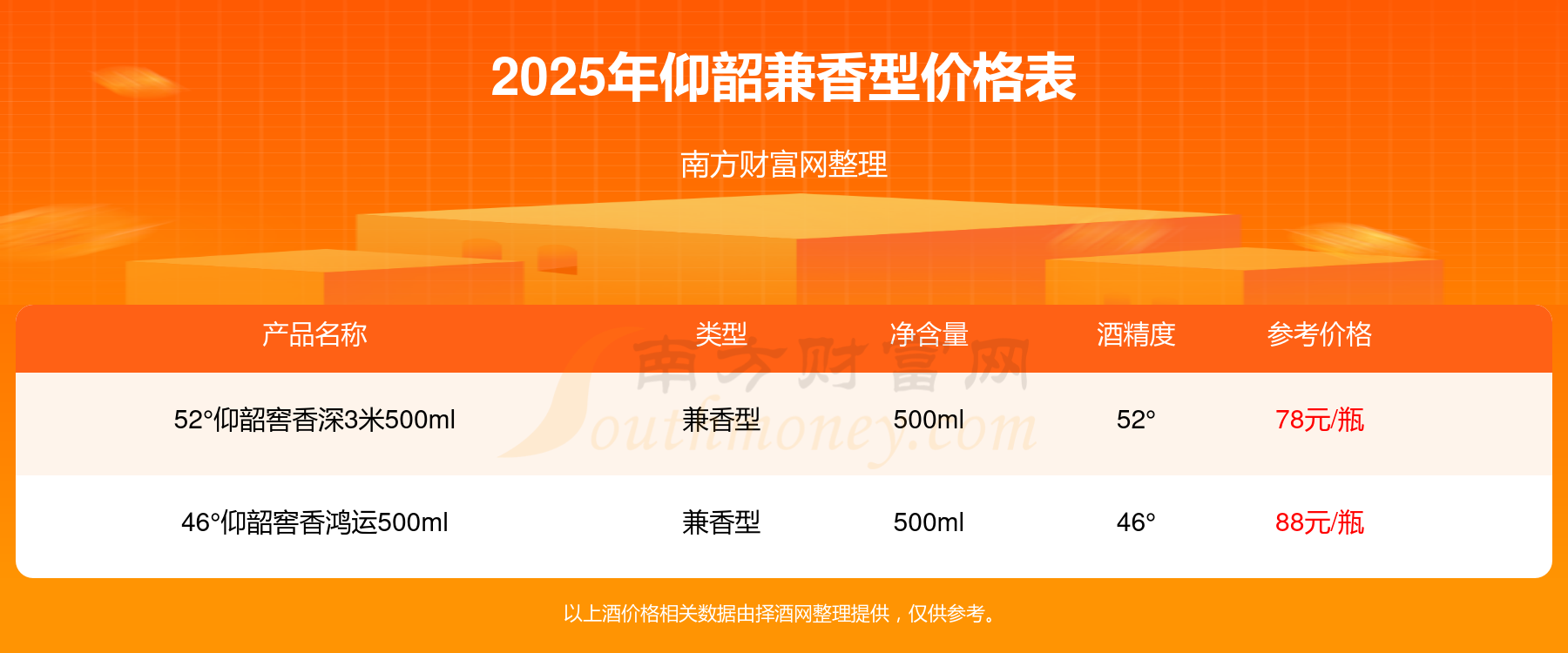 2025年,46°仰韶窖香鴻運(yùn)500ml、52°仰韶窖香深3米500ml等仰韶兼香型酒價(jià)格如下:46°仰韶窖香鴻運(yùn)500ml參考價(jià)88元/瓶、52°仰韶窖香深3米500ml參考價(jià)78元/瓶。