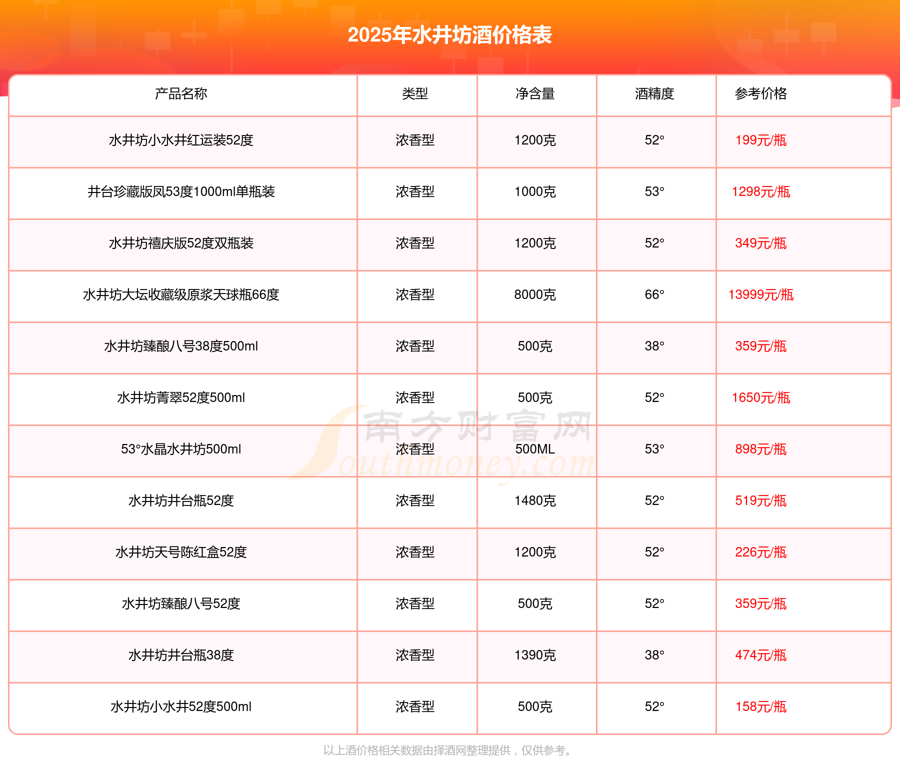 水井坊大壇收藏級原漿天球瓶66度參考價13999元/瓶、水井坊博物館壹號53度雙瓶裝參考價10988元/瓶、53°水井坊公元十三600ml參考價2580元/瓶、水井坊梅蘭竹菊52度濃香型600ml4瓶參考價1999元/瓶、水井坊菁翠52度500ml參考價1650元/瓶。