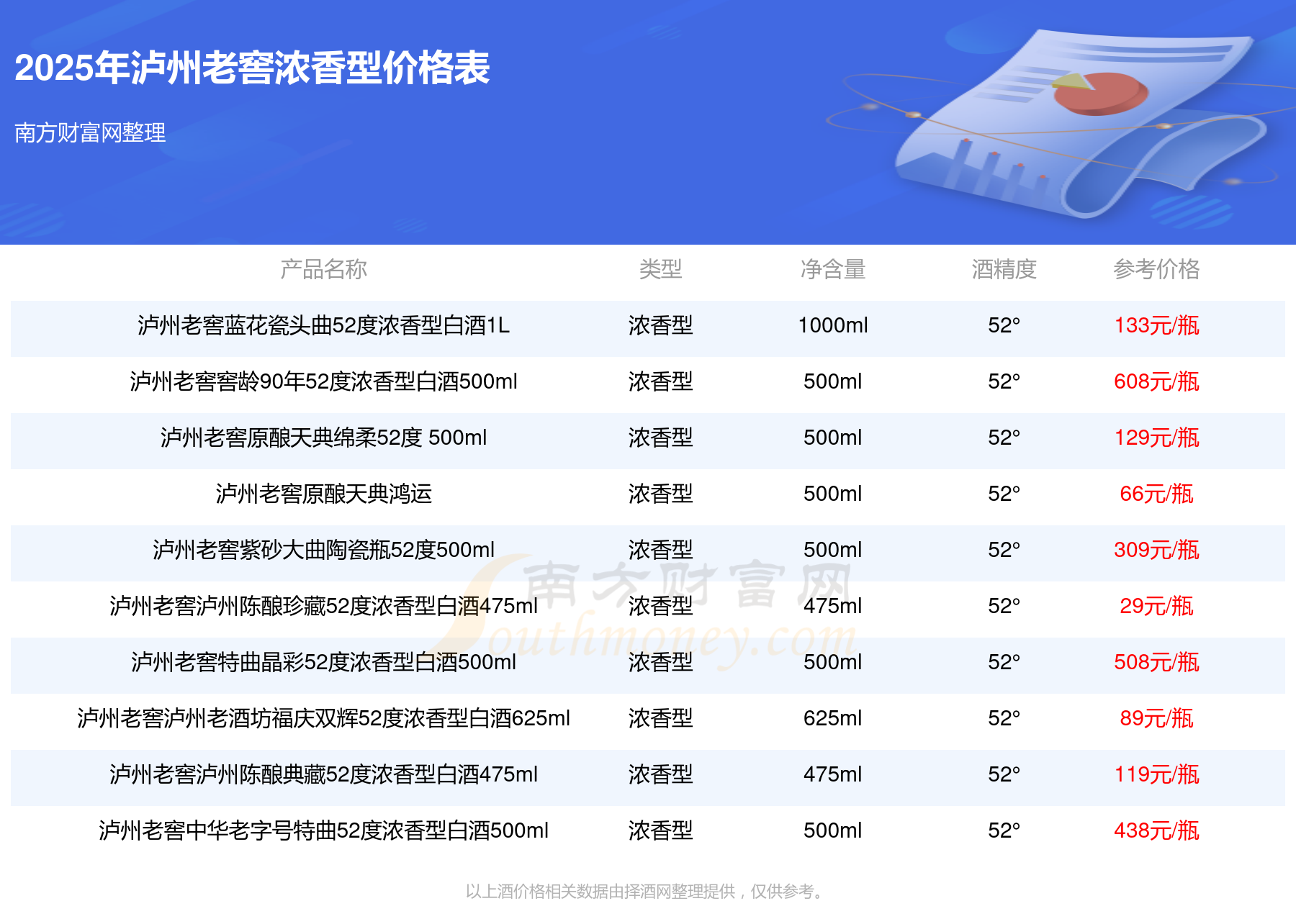 2025瀘州老窖濃香型酒最新價格:瀘州老窖國窖1573春釀鼠兆豐年E 55度參考價17999元/瓶、瀘州老窖國窖1573生命中的那壇酒55度014參考價9999元/瓶、瀘州老窖國窖1573春釀鼠兆豐年A 55度參考價5088元/瓶、瀘州老窖國窖1573生命中的那壇酒55度013濃香型白酒1000ml參考價4988元/瓶、瀘州老窖國窖1573生命中的那壇酒55度009 1000ml參考價4288元/瓶、瀘州老窖國窖1573中國品味52度濃香型白酒500ml參考價2888元/瓶。